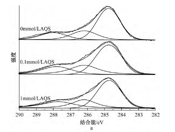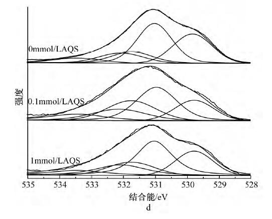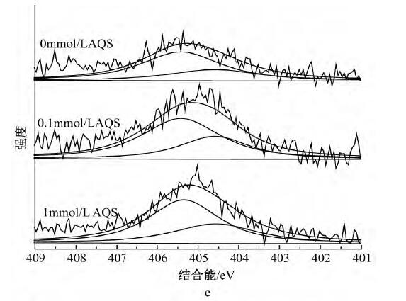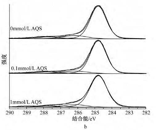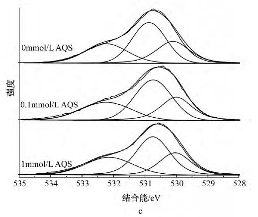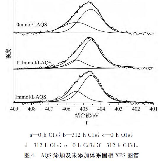為了解AQS的存在是否影響Cd2+的吸附機理,采用XPS對體系中的C、O、Cd元素進行分析。經(jīng)過XPSPeak4.1軟件分峰處理后,圖4a中C1s可擬合出3個峰,其中:284.8eV為C—C/C—H,是表面污染碳[21],286.2eV為C—OH,是MR-1菌表面的醇羥基或醚,287.7eV為C—OOH,是MR-1菌表面的羧基;表明MR-1菌體表面官能團主要為羧基和醇羥基或醚。從圖4b中C1s可以看出:反應(yīng)平衡后所有體系中C—OH和C—OOH峰面積比均有所降低,說明醇羥基或醚和羧基均參與了反應(yīng),而無AQS的體系峰面積比降幅更小,推測由于體系生成的二次礦物較多,增加了溶液中Cd2+的傳質(zhì)阻力,阻擋了菌體表面與溶液中游離離子的絡(luò)和。圖4cO1s中可擬合出3個峰:530.1,530.9,532.2eV分別對應(yīng)絮體中的Fe-O、MR-1菌表面的羧基、醇羥基或醚。圖4dO1s中,所有體系在531.1eV處均出現(xiàn)新峰Fe—OH,且有AQS體系的Fe—OH峰面積比略小于無AQS體系,與XRD分析結(jié)果吻合,說明所形成的二次礦物中針鐵礦和磁鐵礦量(結(jié)晶度稍差)少于無AQS體系,且Fe—O發(fā)生了一定的位移,其中Fe—O包括未被還原絮體中的Fe—O和二次礦物中的Fe—O;另一個新峰為531.7eV處的Cd—O,且0.1mmol/LAQS峰面積比較大,原因是反應(yīng)前期釋放出來的Cd2+更多,菌體表面有機官能團和二次礦物表面存在大量的羥基位點絡(luò)合了更多的Cd2+;所有體系中C—OH均發(fā)生了一定的位移,結(jié)合能均有增加,原因是C—OH中的O含有孤對電子,能與Cd共享電子從而發(fā)生配位絡(luò)合形成Cd—O,從而降低了O原子周邊的電子云密度。圖4e中Cd3d,404.59eV處為Cd—O,405.4eV處為PFS混凝Cd2+產(chǎn)生的峰[26]。而從圖4f中Cd3d可以看出:有AQS體系中Cd—O峰面積比無AQS體系大,與O1s圖譜中的Cd—O一致,其中Cd—O包括二次礦物和菌體表面有機官能團結(jié)合Cd2+形成的Cd—O。