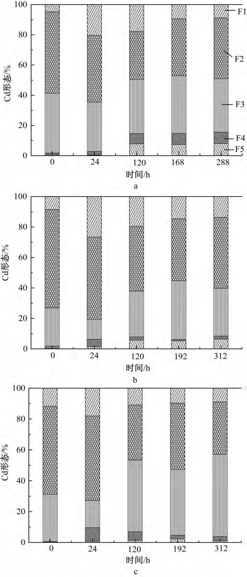由于微生物還原造成了含鎘絮體中鎘的再分配,而AQS的存在影響了含鎘絮體的還原,自然也會影響鎘的可遷移性。因此,進一步探討了在不同濃度AQS存在的條件下鎘的化學(xué)形態(tài)分布。對比無AQS體系(圖5a)實驗結(jié)果[7],有AQS存在時,各化學(xué)形態(tài)的變化趨勢基本相似,但在反應(yīng)初期時,有AQS存在的體系F1態(tài)(溶解態(tài))(圖5b、c)明顯高于無AQS體系(圖5a),說明AQS的存在加速了還原過程的進行。初期24h時,有AQS體系的F4、F5態(tài)總和(強束縛態(tài))(圖5b、c)明顯大于無AQS體系(圖5a),而且1mmol/LAQS體系的大于0.1mmol/LAQS體系,應(yīng)該是由于AQS促進了還原過程,一部分釋放出來的Cd2+通過進入晶格或被包埋等形式進入二次礦物中,形成二次礦物束縛態(tài)。在反應(yīng)進行到平衡時(200h后),1mmol/LAQS體系(圖5c)的F4、F5態(tài)總和比反應(yīng)初期有所減少,說明礦物發(fā)生了陳化,一部分鎘轉(zhuǎn)移到其他形態(tài);而0.1mmol/LAQS體系(圖5b)與反應(yīng)初期相比F4、F5態(tài)總和變化不大,但是F5態(tài)有所增加,F(xiàn)4態(tài)有所減少,應(yīng)該也是陳化的結(jié)果,顯然AQS的濃度對陳化影響很大。而無AQS體系(圖5a)中F4、F5態(tài)總和是明顯上升的,說明形成了較穩(wěn)定的二次礦物;并且有AQS體系中(圖5b、c)F4、F5態(tài)總和明顯低于無AQS體系(圖5a),說明AQS的存在促進了鎘的潛在釋放。反應(yīng)平衡期,無AQS體系(圖5a)的游離Cd2+濃度較低,而0.1mmol/LAQS體系(圖5b)比1mmol/LAQS體系(圖5c)要高,說明AQS的存在對鎘的直接釋放起促進作用,且低濃度AQS促進效果更明顯。另外,1mmol/LAQS體系中(圖5c)的F3態(tài)含量很高,F(xiàn)2態(tài)則與其他兩體系(圖5a、b)差別不大。結(jié)合前面XRD及XPS分析可知:添加不同濃度的AQS,雖然形成二次礦物的種類一樣,但礦物的形態(tài)、結(jié)晶度等顯然不同,因此束縛鎘的能力也不同,所以AQS的存在對鎘的釋放風(fēng)險影響很復(fù)雜。大體上可以認(rèn)為,AQS對鎘的直接釋放和間接釋放都起促進作用,而低濃度AQS更能促進鎘的直接釋放,增大了鎘的潛在釋放風(fēng)險。