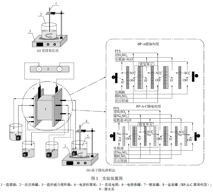 直接氧化法制備PFS 的實(shí)驗(yàn)裝置如圖1(a)所 示,圖中1 為溫感器,2 為反應(yīng)液罐,3 為溫控磁力 攪拌器(HJ-3 型,常州國(guó)宇儀器制造有限公司)。 離子膜電滲析法制備PFS的實(shí)驗(yàn)裝置如圖1(b) 所示。其中,4 為電滲析膜堆;5 為直流電源 (RLD-3005D1 型,上海寰振電子科技有限公司); 6 為電很液罐;7 為酸室罐;8 為鹽室罐;9 為潛 水泵(JY-PG70 型,杭州吉印文化藝術(shù)有限公司)。 本文主要采用兩種電滲析膜堆構(gòu)型:BP-A 構(gòu)型和 BP-A-C 構(gòu)型,BP-A 構(gòu)型膜堆由3 張陰離子交換 膜和3 張雙很膜組成;BP-A-C 構(gòu)型膜堆由3 張陰 離子交換膜、3 張陽(yáng)離子交換膜和3 張雙很膜組成,每張膜的有效面積為0.002m2,膜的性能如表1 所示。