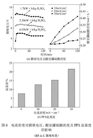 操作條件:反應(yīng)溫度設(shè)置為常溫,反應(yīng)時(shí)間設(shè) 置為120min,反應(yīng)原料組成為1.67mol/L H2SO4 和 4.30mol/L FeSO4(硫酸亞鐵和硫酸的摩爾比為 2.58),膜堆為BP-A-C 構(gòu)型,電流密度設(shè)置為0、 10mA/cm2、20mA/cm2、30mA/cm2。 圖6 是電流密度對(duì)膜堆電壓、酸室罐硫酸濃度 以及PFS 鹽基度的影響(BP-A-C 膜堆構(gòu)型)。對(duì)比 圖5 可知:,同樣的電流密度下,BP-A 構(gòu)型 的膜堆電壓要比BP-A-C 的高,因此BP-A 構(gòu)型的 膜堆能耗比BP-A-C 的高,主要原因是本實(shí)驗(yàn)中制 得的PFS 是無(wú)機(jī)高分子聚合物,其電導(dǎo)率較小,相 比BP-A 膜堆構(gòu)型,BP-A-C 膜堆構(gòu)型增加一個(gè)鹽室, 可以提供多余的電解質(zhì)離子導(dǎo)電,因此降低了膜堆電阻;第二,同樣的電流密度下,兩種膜堆構(gòu)型 較終得到的硫酸濃度相似;第三,相同的電流密 度下,兩種不同構(gòu)型膜堆制備出來(lái)的PFS 鹽基度 差別不大,因此,膜堆構(gòu)型對(duì)鹽基度的改善作用 不明顯。