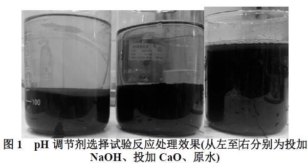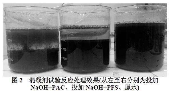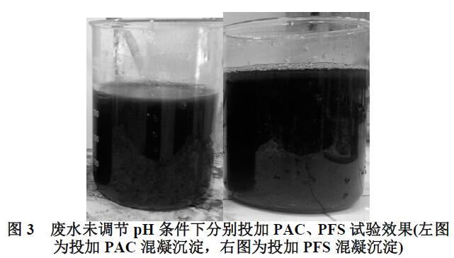 廢水不投加pH調(diào)節(jié)劑,維持原水pH為5.5時(shí),分別單獨(dú)投加200mg/L的PAC、PFS及3mg/L的PAM進(jìn)行混凝沉淀試驗(yàn),試驗(yàn)采取平行對(duì)比三次均值法。試驗(yàn)結(jié)果顯示,不調(diào)節(jié)pH維持原水pH為5.5條件下,分別投加PAC、PFS,兩者均無(wú)明顯表觀反應(yīng),無(wú)沉淀物產(chǎn)生,水樣渾濁(見(jiàn)圖3),經(jīng)取樣分析測(cè)定,兩者對(duì)廢水中的污染物CODCr、LAS、色度均無(wú)明顯去除作用效果。