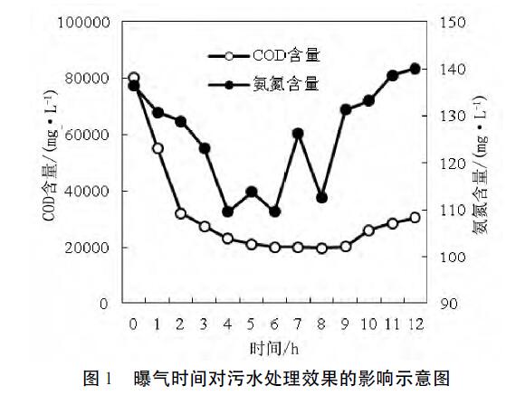 取1組6個250mL的錐形瓶,分別向其中加入100mL的待處理污水,然后向該污水中加入相當(dāng)于污水體積1%的菌液,即1mL的菌液,并且對污水進行曝氣處理,曝氣量為4L/min,每隔一小時取樣記錄污水中的COD與氨氮含量,持續(xù)12h,通過觀察污水中COD與氨氮含量的變化,從而確定較佳的曝氣時間。