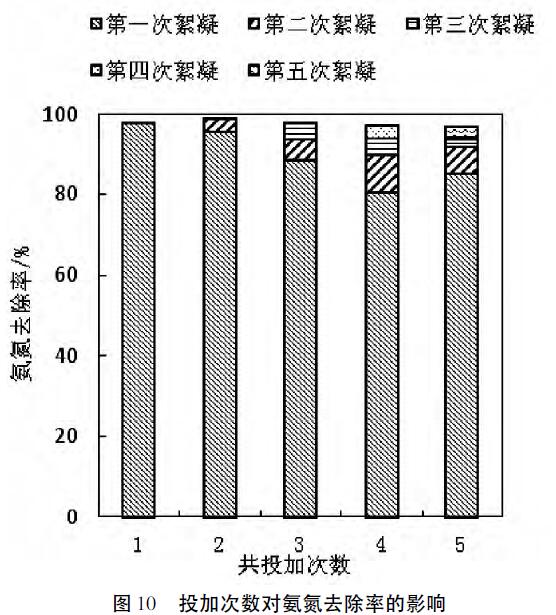 按照nFe2+/nH2O2為1:6的比例,F(xiàn)enton試劑按理論投加量的三倍進行投加,反應(yīng)1.5h,COD的去除率達到了79.9%,經(jīng)處理之后的COD的含量仍高達1460mg·L-1,遠遠高于國家排放標(biāo)準(zhǔn)。根據(jù)化學(xué)反應(yīng)中少量多次的原則,可以將Fenton試劑總的投加量平均分為1、2、3、4、5份,然后分成多次進行投加,對水體進行氧化反應(yīng),考察不同投加次數(shù)對處理效果的影響,結(jié)果如圖9、10所示。將Fenton試劑平均分成4份,分次進行投加時,經(jīng)過四次氧化處理過程后,COD的去除率達到了97.6%,COD含量降至了175mg·L-1,已經(jīng)符合了國家排放標(biāo)準(zhǔn),另外由圖10可以看出,無論Fenton試劑分幾次加入,氨氮的去除率均達到98%以上,并且氨氮含量均低于國家排放標(biāo)準(zhǔn),因此綜合考慮Fenton試劑的較佳投加次數(shù)為4次。