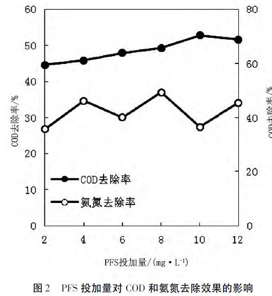 單獨投加不同含量的絮凝劑PFS對經(jīng)微生物處理過的含油污水中COD和氨氮的去除效果如圖2所示。