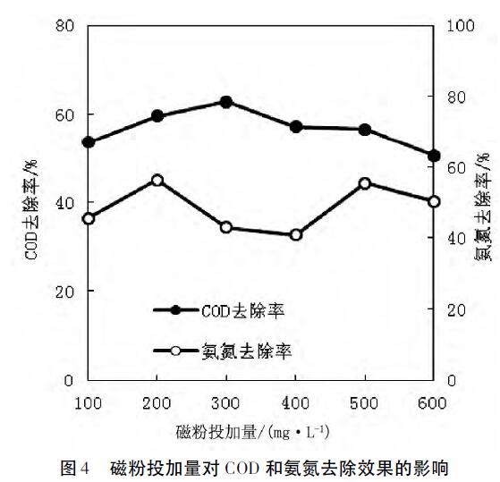 如圖4所示,磁粉的投加量為300mg·L-1時,COD的去除率達到了較高值,為62.8%,比只加入PFS和PAM時的COD去除率高10.0%,這說明加入磁粉有利于提高絮凝效果。磁粉通過吸附-電中作用,同水中的懸浮顆粒一起做為絮體形成凝結(jié)核,形成磁性絮體,由于其重力較大,沉降速率加快,提高了絮凝效果。當(dāng)磁粉投入量過高時,絮凝效果下降,顯然磁粉量加入量過高,會造成磁粉吸附其他的污染物,降低了COD的去除率。如圖4所示,隨著磁粉的投加量發(fā)生變化,水體氨氮的去除率呈現(xiàn)一個不規(guī)則的變化,說明磁粉的投加量與廢水中氨氮的去除沒有明顯的相關(guān)性,所以磁粉的較佳投加量應(yīng)該由COD的去除率所決定,確定為300mg·L-1。