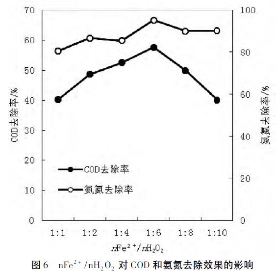 對Fenton試劑氧化處理效果的影響以30%的H2O2溶液的理論投加量為基準(zhǔn)加入量,通過改變FeSO4溶液的加入量來控制nFe2+/nH2O2的數(shù)值,使nFe2+/nH2O2分別為1:1,11:2,11:4,11:6,11:8,11:10,經(jīng)處理后測定水樣的COD與氨氮含量,考察nFe2+/nH2O2對Fenton試劑氧化處理效果的影響結(jié)果如圖6所示。