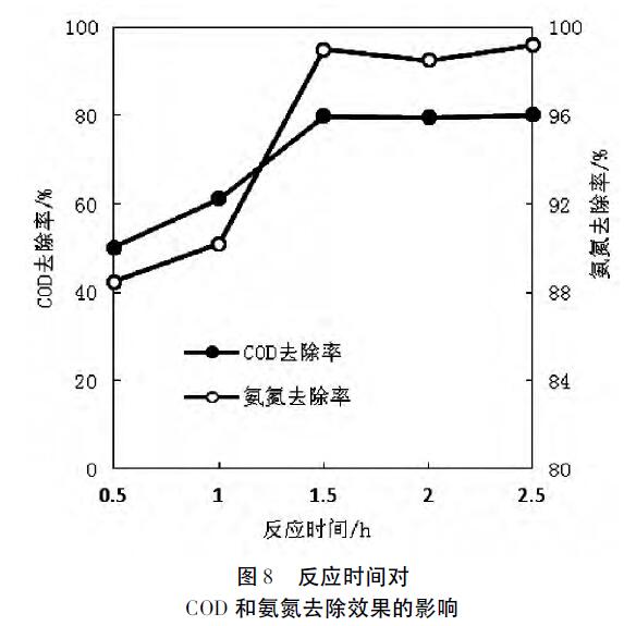 如圖8所示,反應(yīng)時間為1.5h時,COD的去除率達到了較高值79.9%,反應(yīng)時間繼續(xù)增加時,COD的去除率變化幅度很小,基本可以忽略不計。如圖15,反應(yīng)時間為1.5h以及以上時,氨氮的去除率均達到了98%以上,綜合考慮較佳反應(yīng)時間為1.5h。