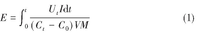 能耗是雙很膜電滲析過程的一個重要指標。本實驗中, 雙很膜產(chǎn)生的OH-部分參與PFS的制備, 很難測定OH-的產(chǎn)生總量。因此, 能耗E (kW·h/kg H2SO4) 的計算基準為雙很膜產(chǎn)生的H+量, 具體計算如式 (1) 。